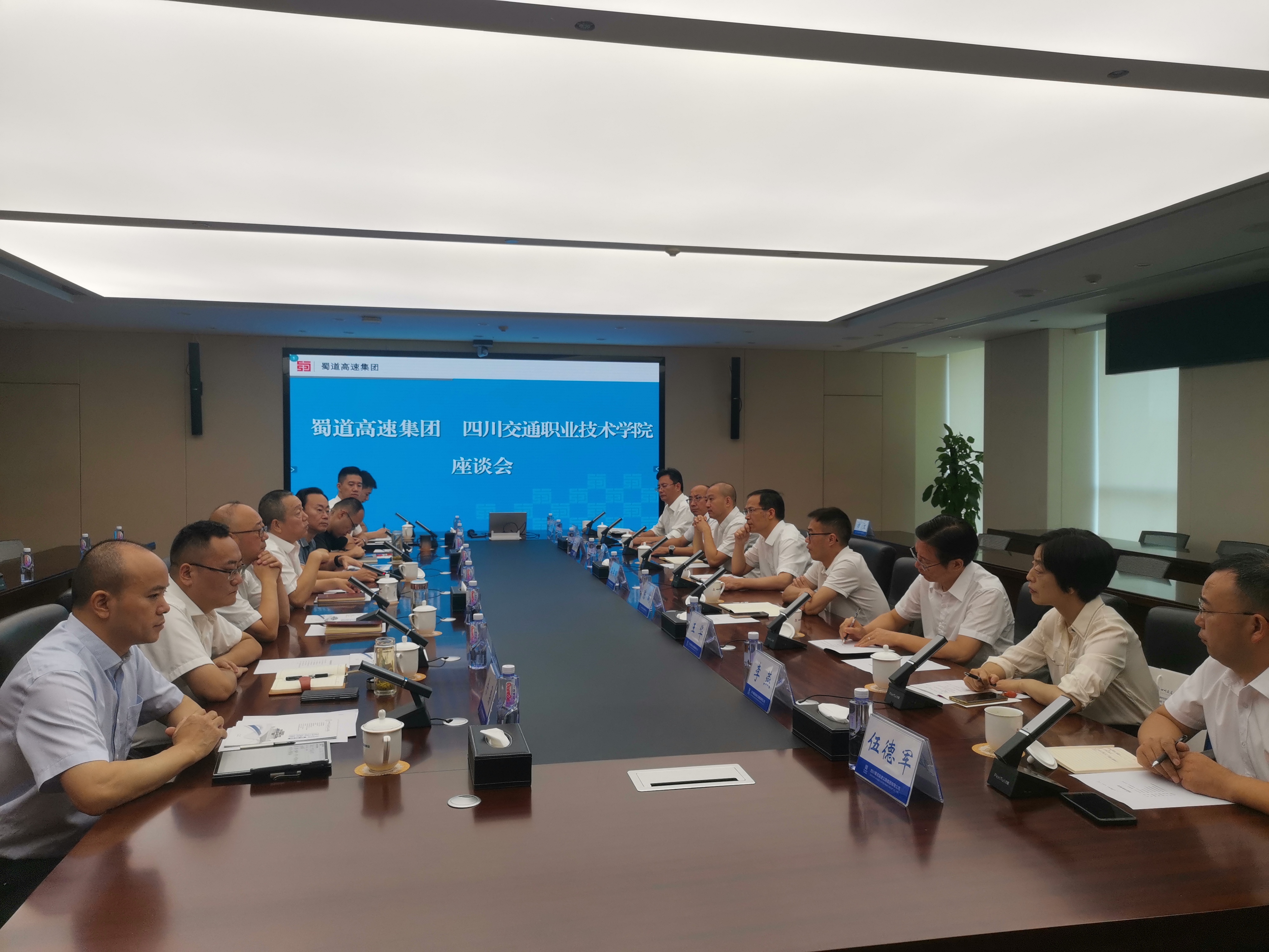 9月19日,学院党委书记冯书明,党委副书记、院长陈斌和相关部门、教学系部一行到四川蜀道高速公路集团有限公司(简称“蜀道高速集团”)开展座谈交流。蜀道高速集团党委书记、董事长白茂,党委副书记、副董事长、总经理肖波,党委委员、副总经理郑伟,副总经理鲜峻岭和集团相关部门负责人参加会议。