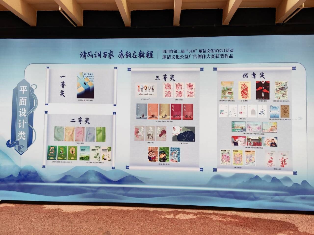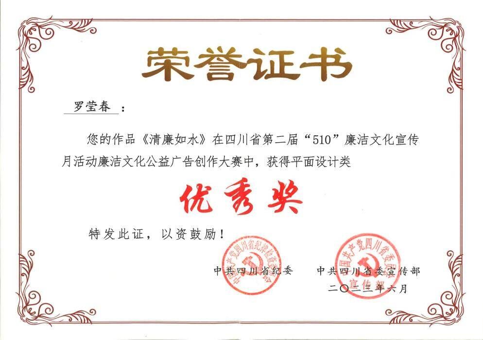 艺术与设计系学生罗莹春创作的平面广告作品《清廉如水》参加四川省第二届“510”廉洁文化宣传月活动——廉洁文化公益广告创作大赛,在全省5880个作品中脱颖而出,排名11位,荣获优秀奖。其作品在清廉交院板块的清廉作品中展出。