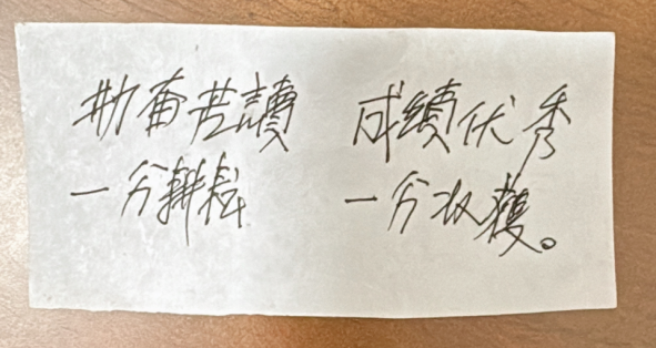 外公外婆非常注重家庭教育,他们用自己的言行教导我们晚辈如何做人、如何处事。我成长的过程中听到很多长辈对外公外婆的评价:难得的好人。无论是对待工作的认真负责,还是对待家庭的无私奉献,他们都以实际行动为后辈做出了最好的表率,潜移默化中,这样的家风就像一股无形的力量在我们后辈身上发挥着作用。于是我早早便学会了诚实守信、尊老爱幼、勤俭节约、严于律己、宽以待人等传统美德。记得当初年少的我要离家求学,外公给我写了一张便条,此后这张便条便一直陪伴着我,至今已20余年,那句叮嘱的话早已印刻在我心中“勤奋苦读,成绩优秀,一分耕耘,一分收获。